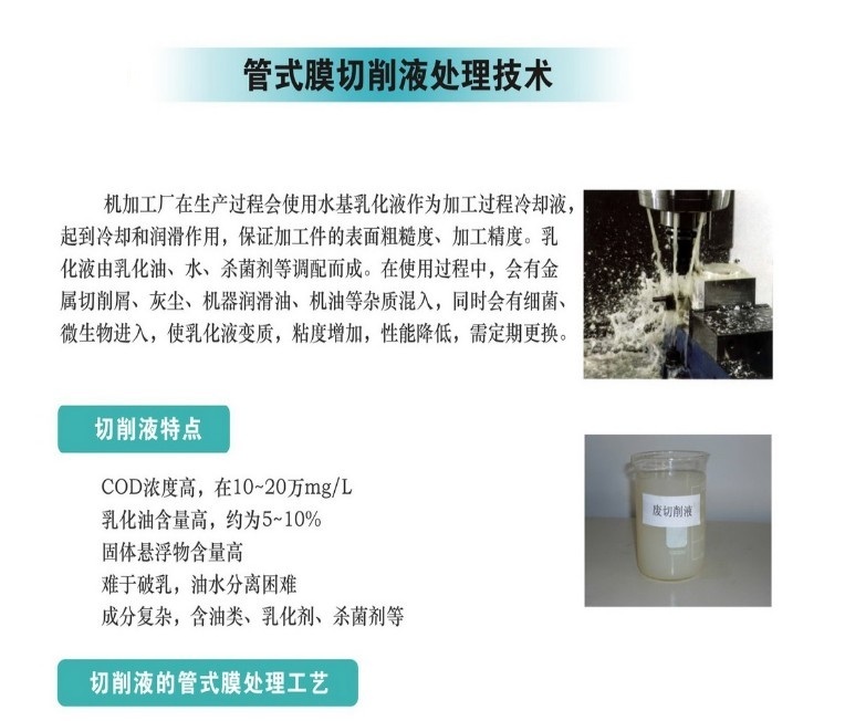 我公司開(kāi)發(fā)出來(lái)一種非常簡(jiǎn)單實(shí)用的膜處理技術(shù),可以進(jìn)行油水費(fèi)力,綜合多項(xiàng)膜技術(shù)和生物技術(shù),可以使得廢舊切削液達(dá)標(biāo)排放,降低工廠廢舊切削液處理成本80%以上。